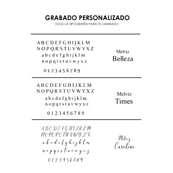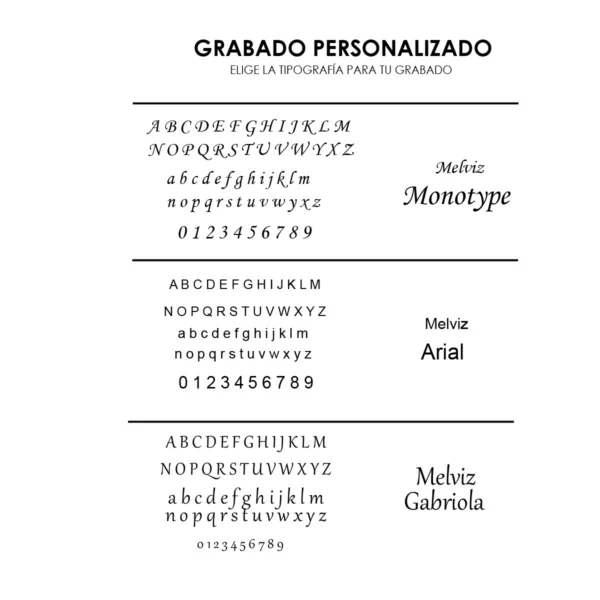 Selecciona la tipografía que más te guste e indícanos los detalles del grabado en la opción de «Información adicional del pedido» en tu carrito de compras.
